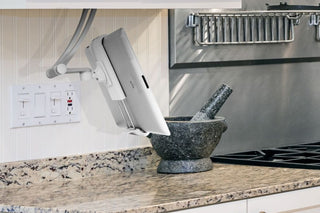 The durable wall mount plate will securely hold the heaviest of tablets, even when operating the arm to your liking as a cabinet mounted tablet holder or ipad countertop mount
